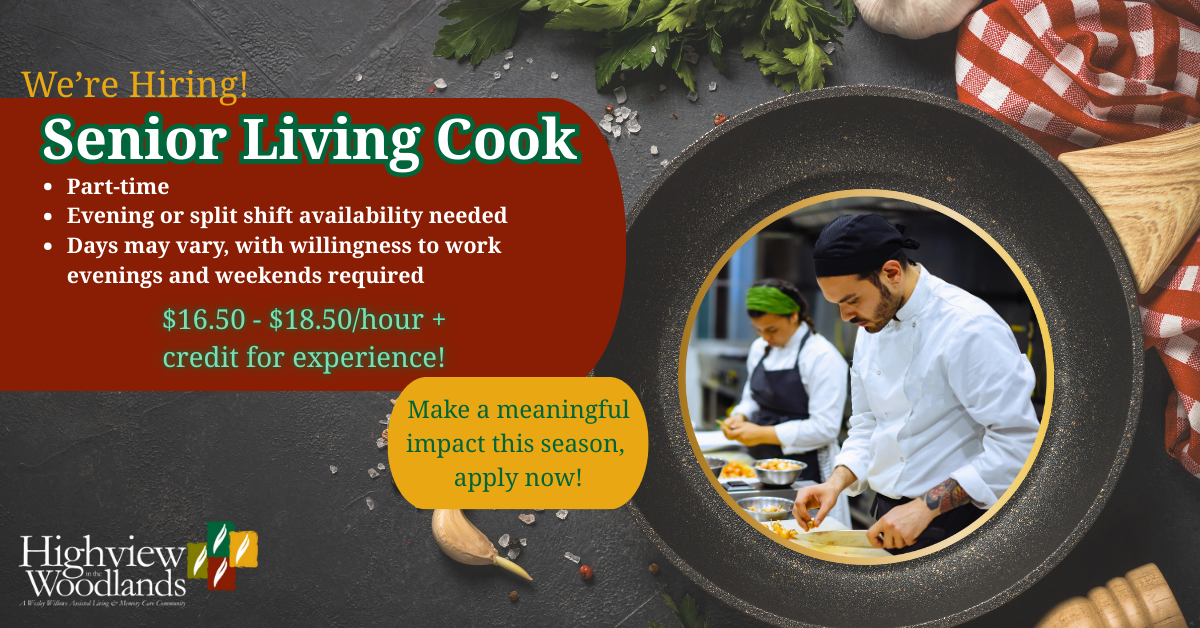 Start a meaningful career as a Cook at Highview in the Woodlands, a Wesley Willows senior living community.